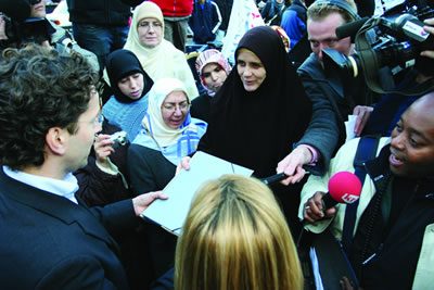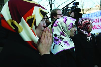 The company adjusts the configuration of the performance for each venue and context. Sometimes the performers begin the evening by sharing cups of mint tea and sweets with the audience, and depending on the audience and the space, the event can take on a heightened communal spirit far exceeding the clinical qualities of a traditional “aesthetic” theatre performance. Since 2003 Roosen’s company has performed the monologues in large state theatre houses in Europe as well as at nontraditional performance venues of all sizes — for example, adjacent to a mosque in Deventer and in community centers before groups of Muslim women, their daughters and sisters and mothers. Roosen emphasizes that the piece was created primarily for Western audiences, despite her successes in other settings. One of her greatest triumphs came in spring 2005, when Roosen enlisted the help of women legislators from across the political spectrum — led by the Green Party’s Femke Halsema and Liberal Party MP Ayaan Hirsi Ali — and arranged a performance before the Dutch Parliament.