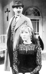Loot takes place behind a looking glass that turns values, institutions, and beliefs inside out. The tricksters win, and the only law-abiding citizen in the play, Mr. McLeavy, goes to prison. Characters contradict assumptions about their roles: Fay, the nurse, has a track record of killing, rather than healing, husbands; Inspector Truscott of the Yard beats up London’s citizens; Hal, a good Catholic son who can’t tell a lie and refuses to look at his mother’s naked corpse, is a homosexual crook; Dennis, Hal’s partner in crime and bed, is engaged to Fay; even dead Mrs. McLeavy, revered by the community bingo circle and buried in her Women’s Voluntary Service uniform, led a double-life. Placing an embroidered text on Mrs. McLeavy’s coffin, Fay delivers one of Orton’s famous quips: “Here–the Ten Commandments. She was a great believer in some of them.”