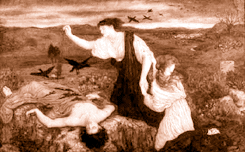 Creon’s first action as king is to forbid anyone to bury Polynices, whom he regards as an enemy of the city. Everyone else thinks his action is wrong, but everyone except Antigone is afraid to do anything about it. Antigone insists that, as his closest relative she is obliged to bury her brother. Her sister Ismene, an equally close relative, is too frightened to want to help. The old men of Thebes, who form the Chorus of the drama, are also reluctant to get involved. All they are prepared to do is to decline to assist Creon in enforcing his edict. The sentry makes it clear that he and his fellow soldiers are equally uncomfortable with Creon’s order, but (like Ismene and the Chorus) they are afraid of what Creon will do to them if they disobey. Meanwhile Antigone goes outside the city walls to cover the body with ceremonial dust. The soldiers, following Creon’s orders, wash the corpse clean, but then there is a dust-storm. As it clears, the soldiers see Antigone, once again sprinkling dust and pouring libations on Polynices’ corpse.