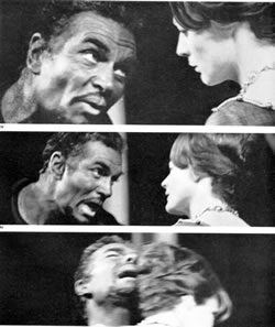 Once Iago has succeeded in securing Roderigo, his action is complete. He precipitates a new event by suggesting that Roderigo should wake up Brabantio, Desdemona’s father. The two men yell in the street outside Brabantio’s house – a short, transitional episode, shaded gray on the diagram to distinguish it from the major events of the scene – until the old senator comes to the window, and a new action begins. Here there is no mistaking Roderigo’s intention. In love with Desdemona, he tells Brabantio of her elopement with Othello, and by rousing his fury he attempts to gain his trust, as Iago had secured his trust only moments before. Roderigo soon achieves his goal, and Brabantio disappears from the window to determine Desdemona’s whereabouts. In another short transition, Iago takes his leave of Roderigo, after which Brabantio appears on the street. Choking with rage and fear at his daughter’s conduct, he is at first barely coherent. At last, however, Brabantio regains his self-possession, and, setting off to find Othello, brings the scene to a close.