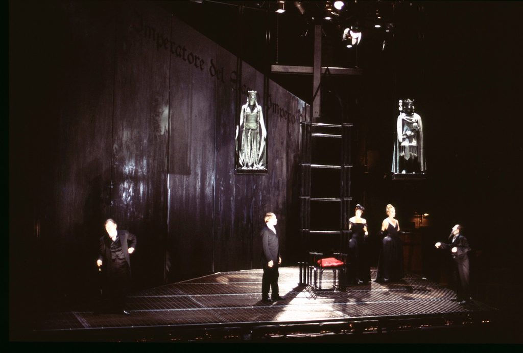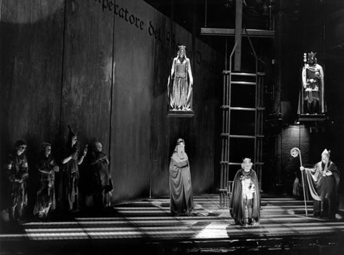 Twenty years ago, a group of friends costumed themselves as historical characters and rode in cavalcade. A young aristocrat, dressed as the Holy Roman Emperor Enrico IV, fell from his horse and hit his head, fixing his assumed identity. Frozen as Enrico, he has lived for the last decades as an Emperor surrounded by his servants. In his castle he installs great effigies of himself and his lover, dressed as Enrico and Matilda of Tuscany, the historical Enrico’s rival.